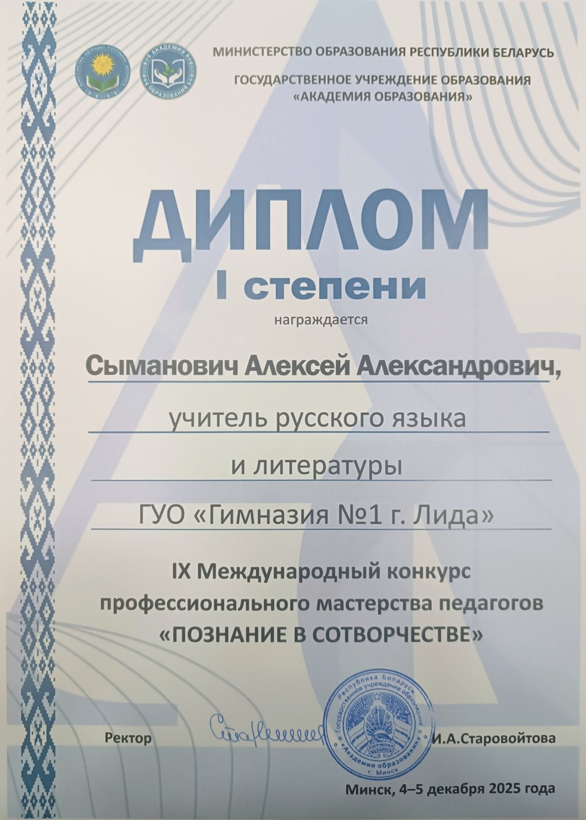 В Академии образования завершился Международный конкурс профессионального мастерства педагогов "Познание в сотворчестве". По итогам заочного этапа и очной защиты творческой работы блестящую победу с максимально возможным количеством баллов одержал учитель-методист гимназии №1 г.Лида Сыманович Алексей Александрович. Поздравляем!