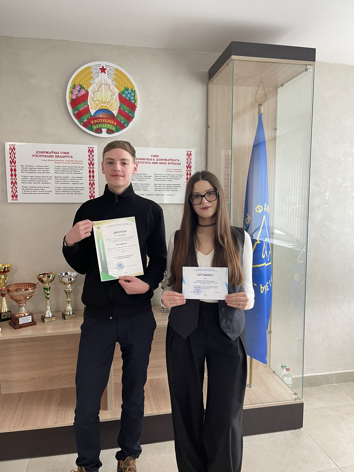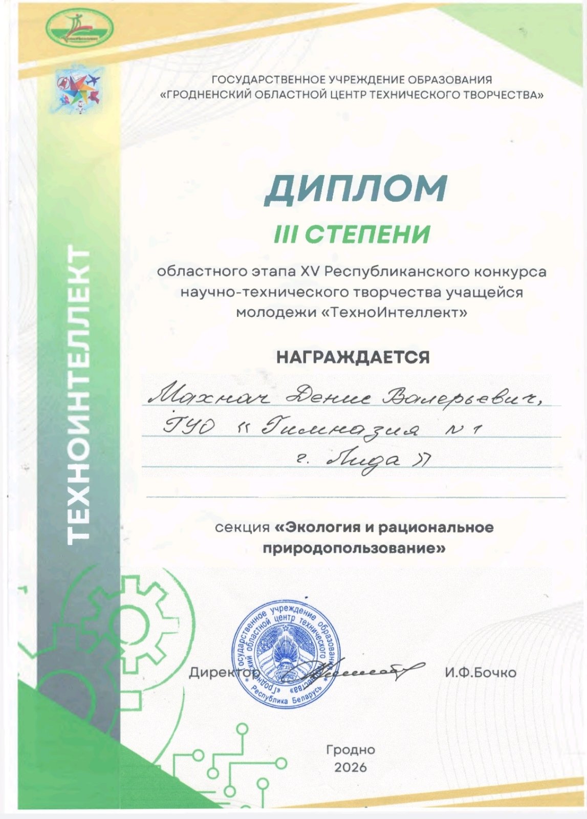 Поздравляем Махнача Дениса, завоевавшего диплом 3 степени, и Струкель Владу, достойно представившую исследовательскую работу на областном этапе XV Республиканского конкурса научно-технического творчества молодёжи "ТехноИнтеллект". Руководитель - учитель химии гимназии №1 г.Лида Махнач Юлия Ивановна.